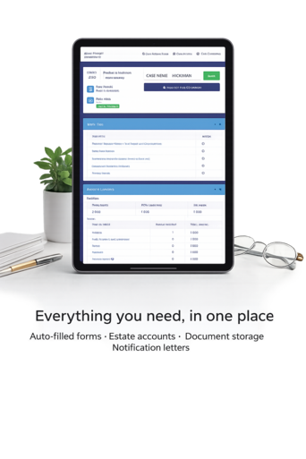 Probate involves multiple stages, complex calculations, and detailed record-keeping—making it easy for things to become disorganised or overlooked. Probate Toolkit brings everything together in one place, from asset tracking and inheritance tax calculations to document storage and estate accounts. By automating key steps and structuring the process, it reduces errors, saves time, and keeps you fully in control. Whether you’re an executor or a professional, it simplifies probate into a clear, manageable workflow from start to finish.
